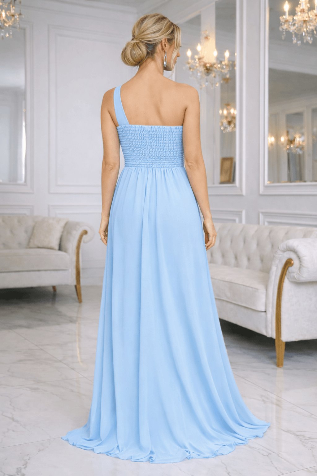 Světle modré společenské šaty na svatbu pro družičky nebo svatební hosty