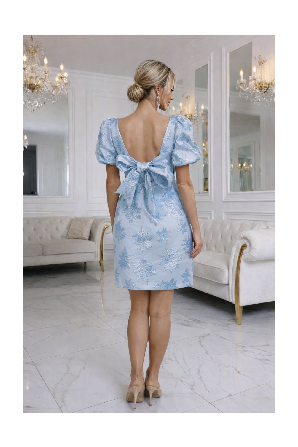 Světle modré žakárové šaty Eleonora s mašlí na zádech