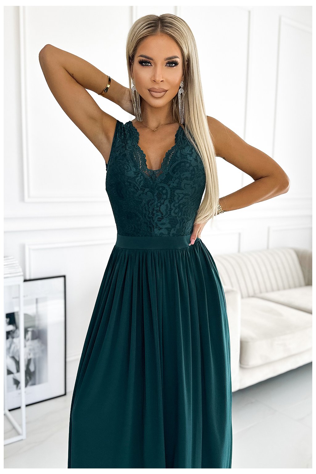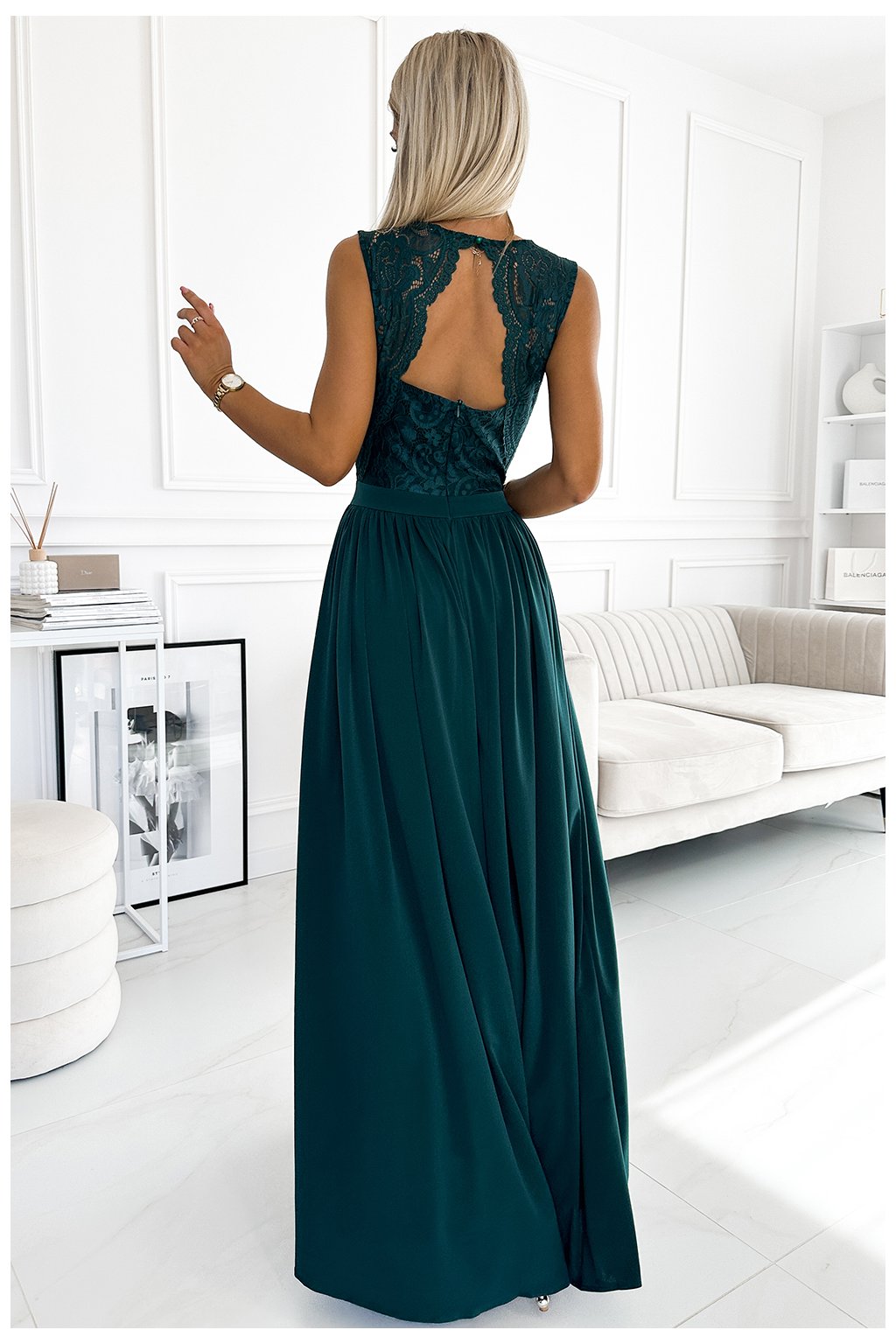 Modelka je vysoká 165cm a má na sobě velikost S (pod šaty má 10cm podpatky)