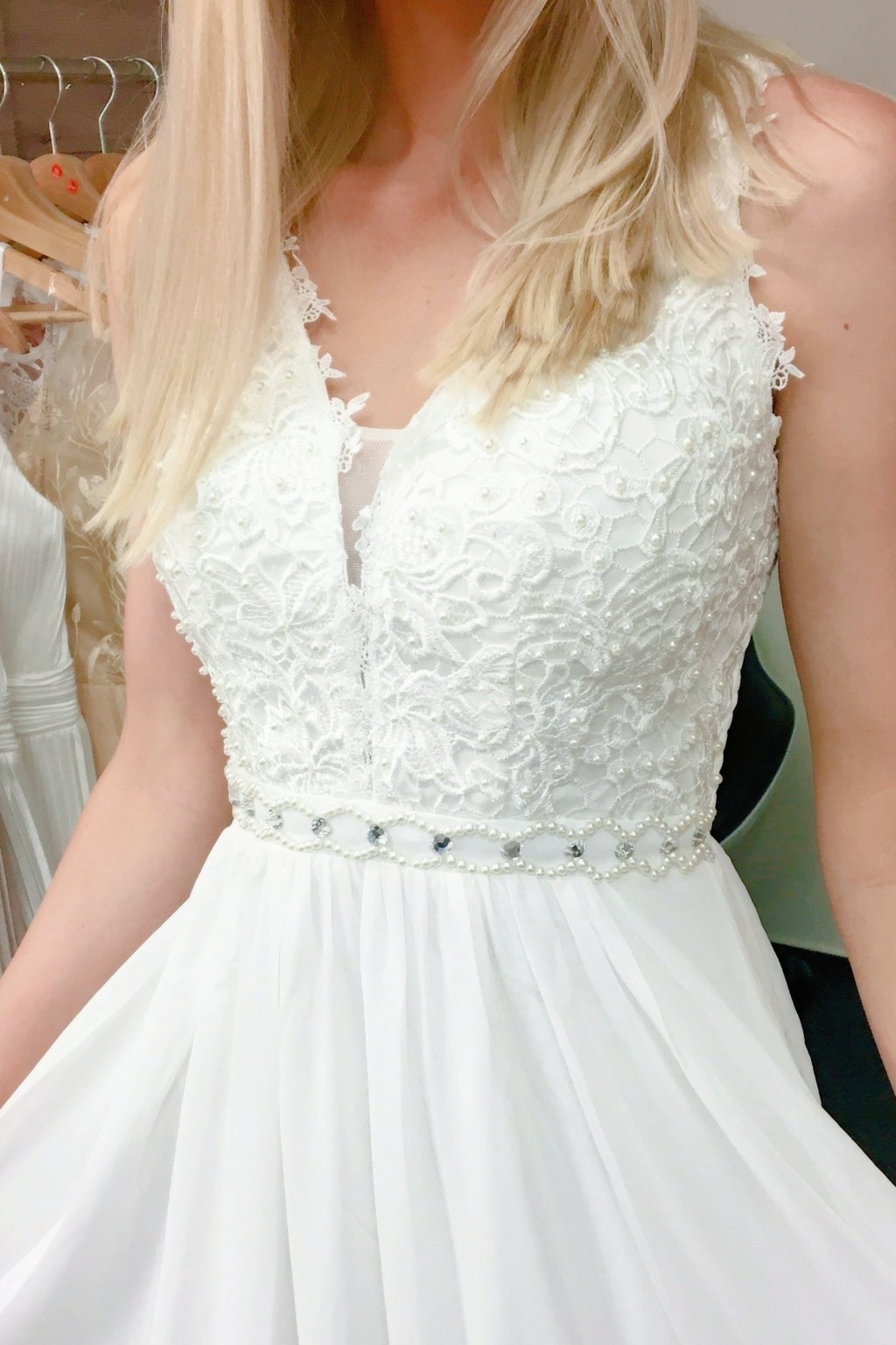 - decentní našívané zdobení v podobě drobných perliček v barvě šatů na krajkovém dekoltu