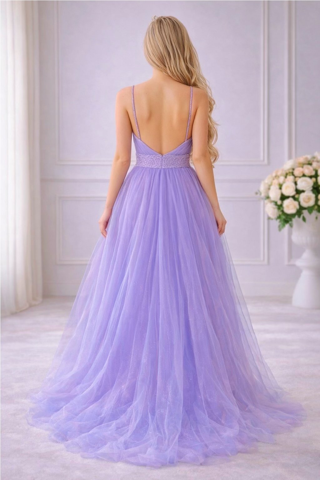 Šaty mají všitou podprsenku, otevřená záda a jsou celo-třpytivé díky drobným třpytkám, které jsou po celé délce šatů.