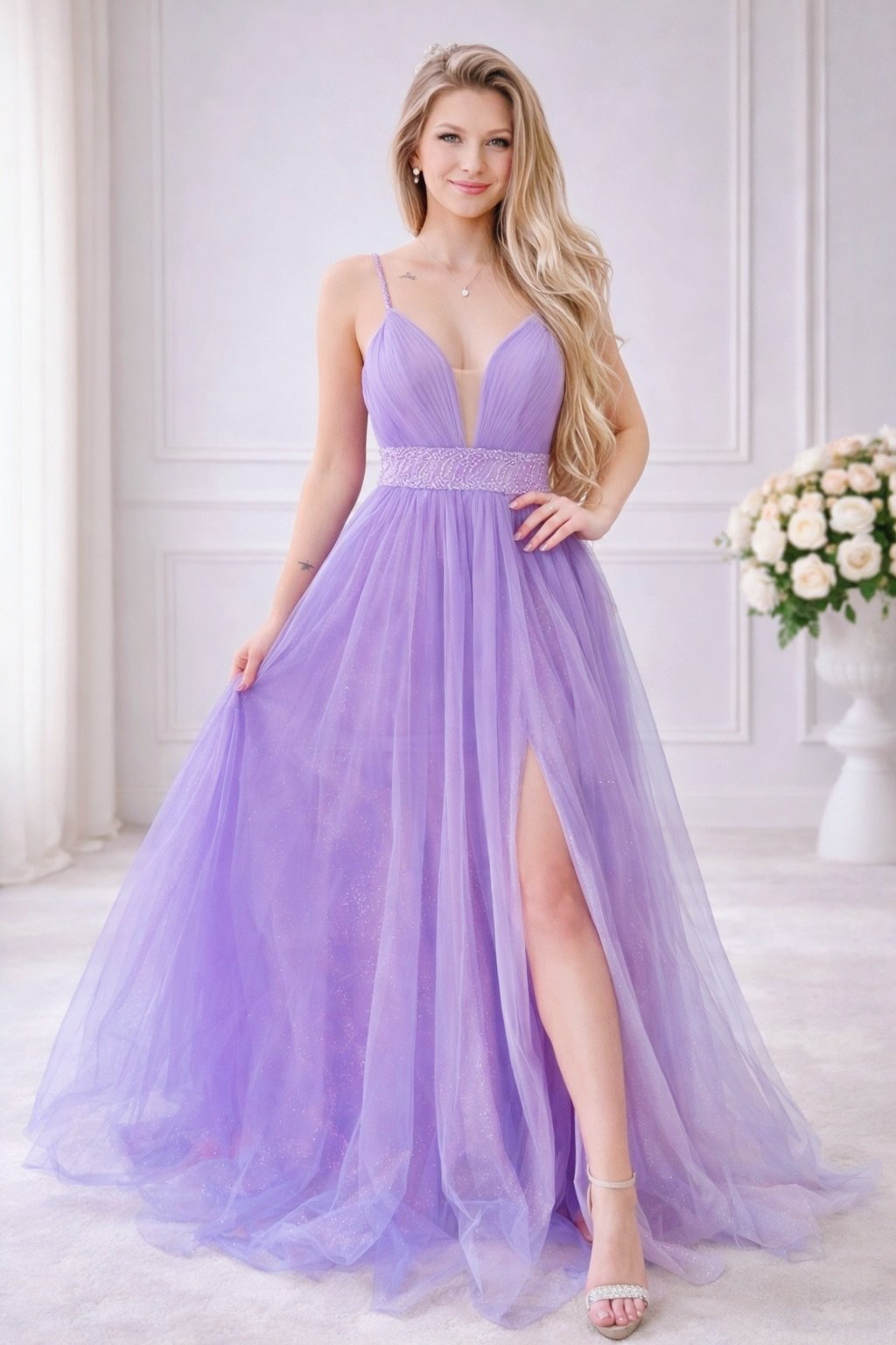 Společenské šaty jsou v evropské společenské délce.