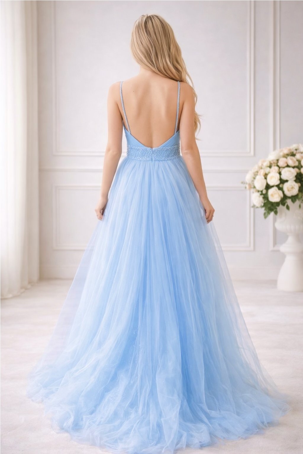 Nádherný vrstvený tylový materiál s bohatou sukní, vnitřní sukně je posetá třpytkami, které vytváří efektní odlesky.