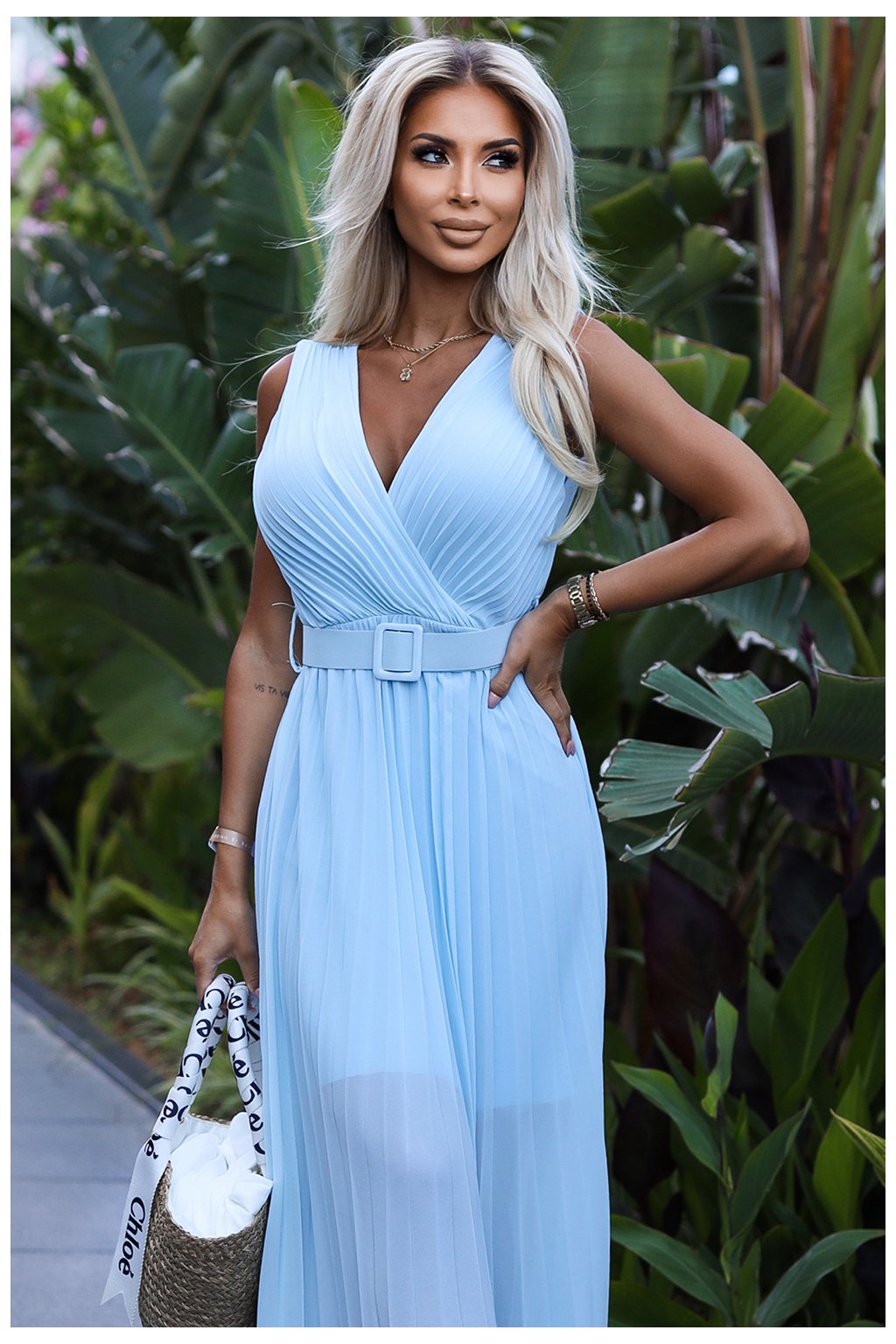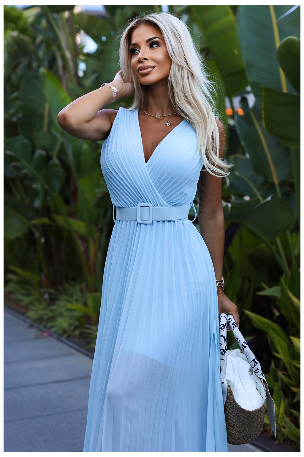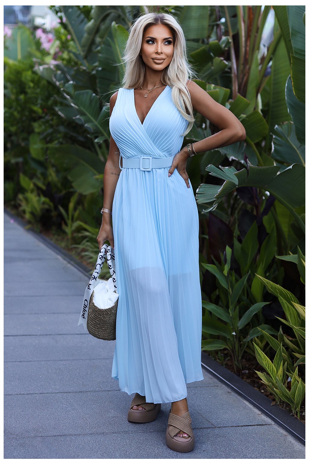 Světle modré šaty Karolina s páskem a plisovanou sukní