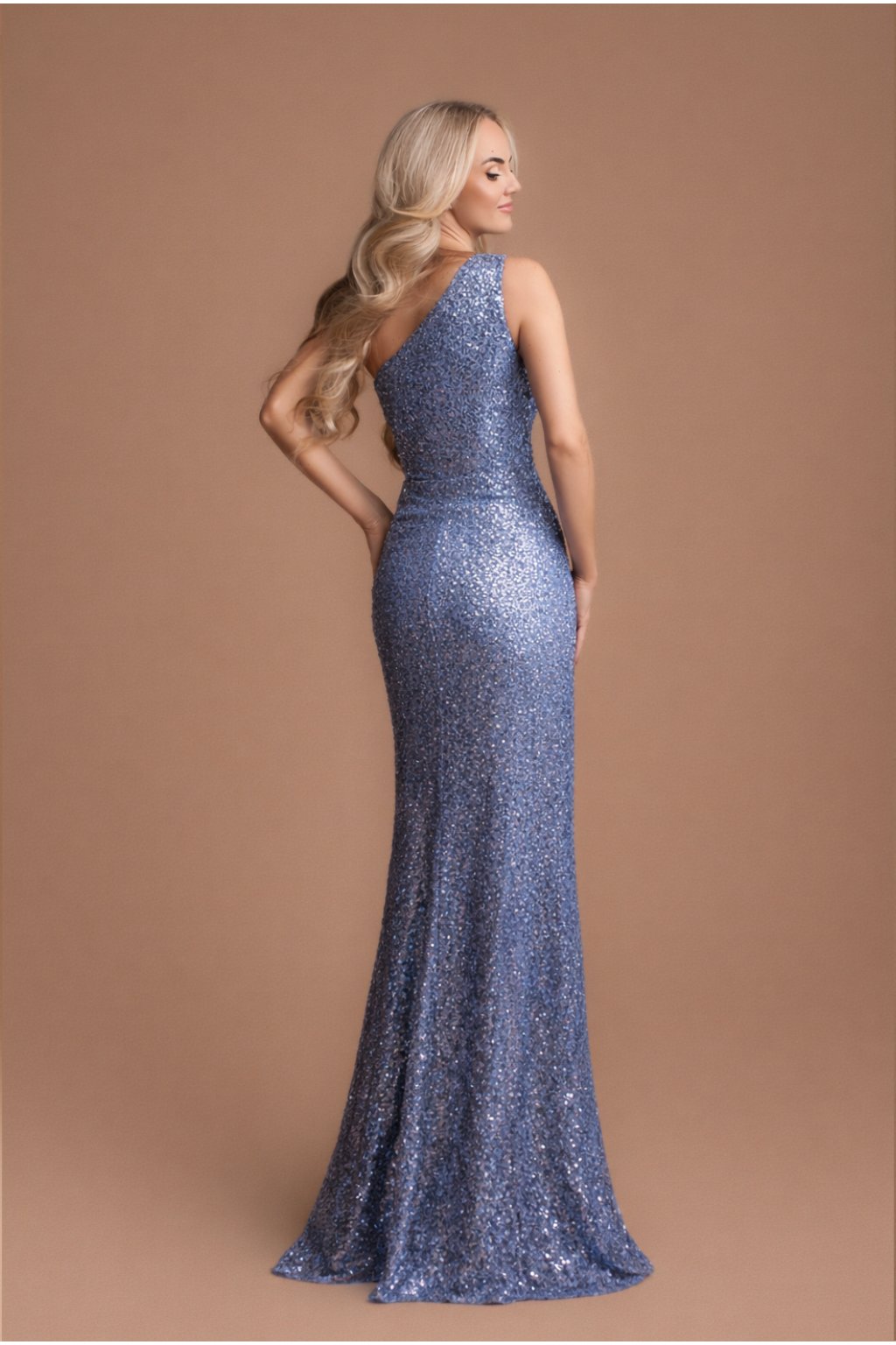 Světle modré třpytivé asymetrické plesové šaty Solange s rozparkem