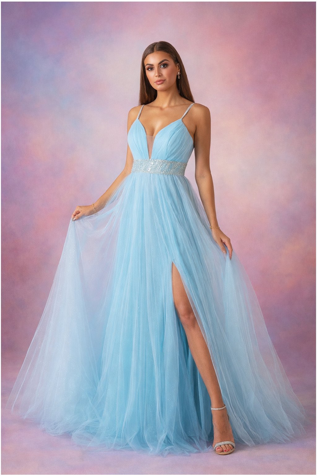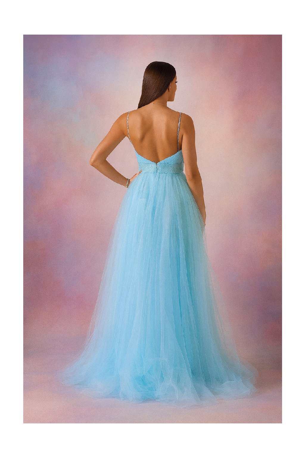 Nádherný vrstvený tylový materiál s bohatou sukní, která je v několika vrstvách třpytivá a dodává šatům na luxusu.
